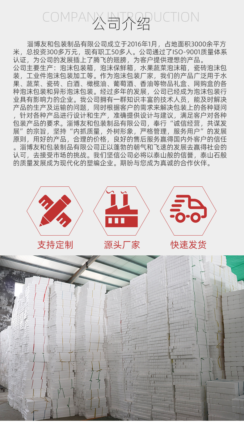 ????淄博友和包裝制品有限公司是專業(yè)的山東泡沫包裝箱加工廠家,本廠主要產(chǎn)品有:泡沫包裝箱,泡沫保鮮箱,水果蔬菜泡沫包裝箱,水果蔬菜泡沫保鮮箱,瓷磚泡沫包裝箱等,產(chǎn)品暢銷全國,深受用戶好評。泡沫包裝定做可以聯(lián)系我們網(wǎng)站 http://m.wlsaijn.com.cn/ 上電話,我們會第一時(shí)間跟您聯(lián)系。